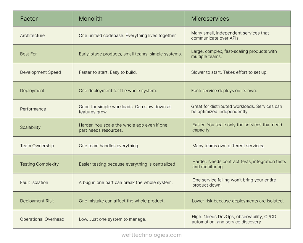 If your product is simple, like a SaaS dashboard, a booking system, a marketplace MVP, a CRM for small businesses, or a simple custom software development project, microservices will only add complexity. On the other hand, a monolith will do the job perfectly and will be easier to manage.